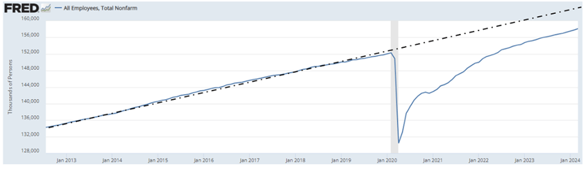 El gráfico a continuación muestra la recuperación de empleos en EE.UU. tras la pandemia, indicando más una restauración que una creación neta de nuevas posiciones laborales.