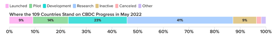 En mayo del 2022, más de 100 países que representan más del 95% del PIB Mundial estaban explorando activamente o habían explorado previamente una CBDC.