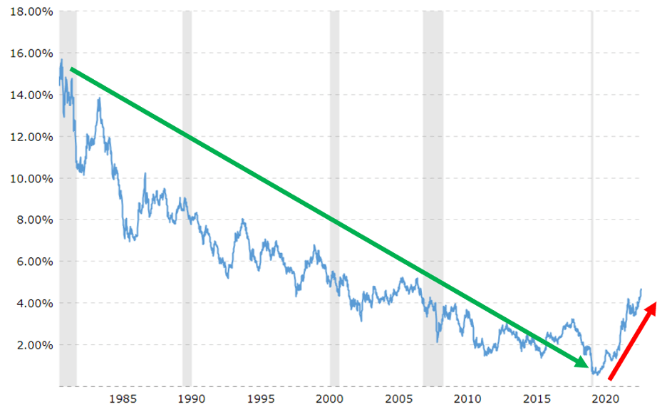 Abajo, podemos observar el rendimiento del bono a 10 años norteamericano., desde principios de los años 80 del siglo pasado hasta hoy.